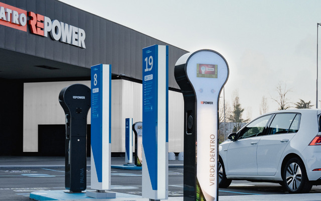 Il grande hub Repower che mette a disposizione 20 postazioni di ricarica per auto elettriche, nella zona sud di Milano.